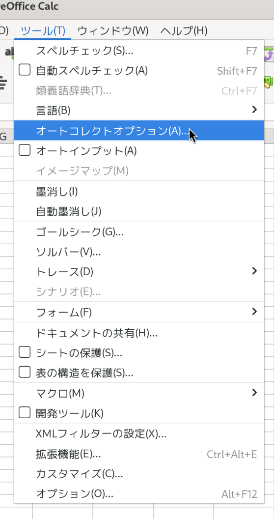 メニューバーから、「ツール」-「オートコレクトオプション」で、