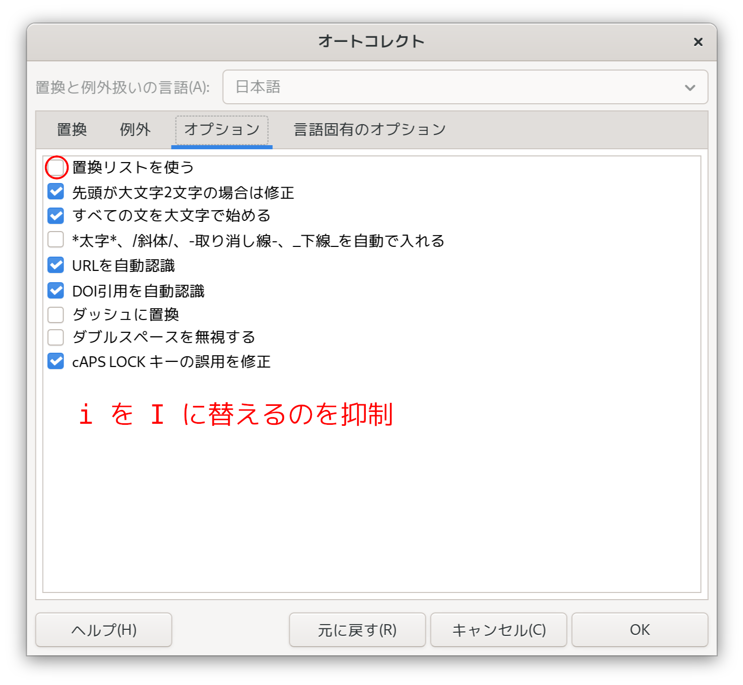 置換と例外扱いの言語:の欄を[英語]にすると、 i を I にする設定があります。スクロールするか、「置換」の欄に i を入れると確認できます。もちろん、これ一つを[削除]するという手もあります。この置換表の量から、同じものをワープロのWriterでも使っているかもしれないとも考えて、そのままにしました。