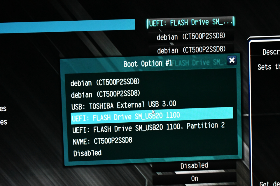 USBから起動するようにBIOS(正確にはUEFI)設定。起動中に[DEL]キーを押して設定に入り、Boot順序を設定します。 このBIOS設定では選択肢の中に "UEFI:FLASH Drive SM_USB20 11100" と "UEFI:FLASH Drive SM_USB20 11100, partition 2" の2つがあります。多分どちらでも同じUSBメモリからの起動になると予測して、前者を先頭に選択しました。ディスクからの起動が旧来のBIOSからUEFIに変わっていく中、Linuxでは両方で起動できるようにしてあるのだと考えています。
