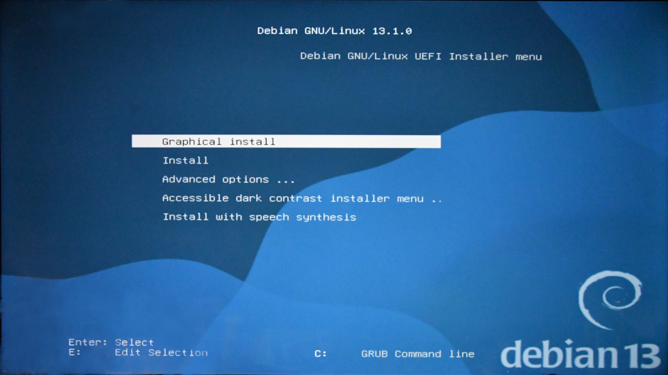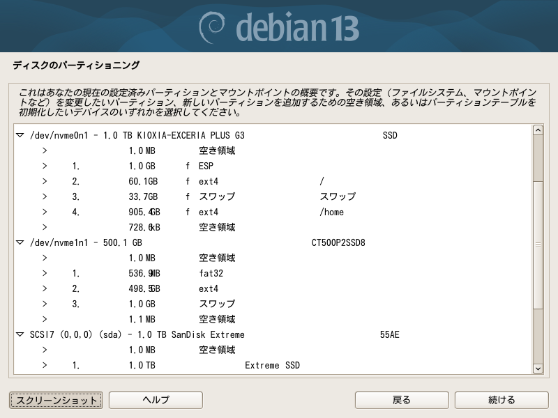 2025-08-09に安定版になったDebian13(trixie)ですが、いつも使っているPCへの導入は10月になってしまいました。このPCはDebian12のリリースを待ちきれずに2023年の2月にDebian11(bullseye)をインストールしたものです。世の中が12のときに11を使い続け、12をスキップして13を入れるということになりました。