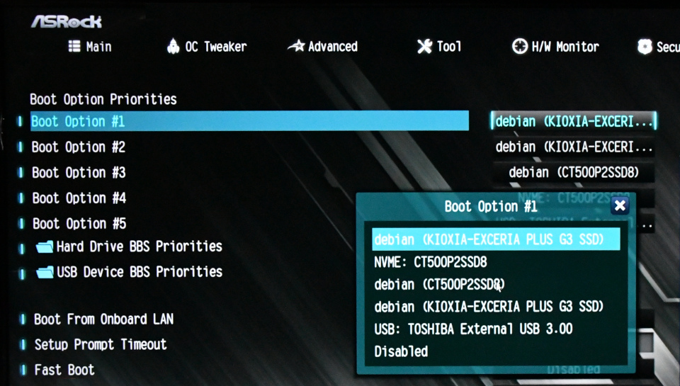 BIOS(正確にはUEFI)設定のbootの順位の設定です。CT500P2SSD8 が旧SSDですが、NVMEとdebianの2項目になっているけれど、KIOXIA はdebianが2項目でどういう仕組みか理解に苦しみます。USBもひとつだけ候補に上がっています。ここからは起動するようになっていないはずです。