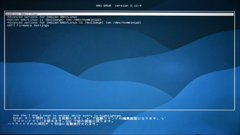 もう一つ、GRUBというブートローダをインストールする前に確認することが多いのですが、今回はそれがありませんでした。取り付け位置を移動したSSDにDebian11がインストールされているのでそれを検出したはずですが、聞いてきていません。ESPパーティションができてインストールする場所が変更になったことによるのかもしれません。