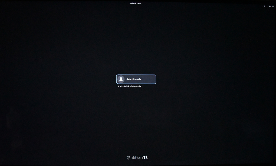 ログイン画面です。ユーザーをここから選択するようになっているのですが、インストール時には1人のユーザーしか登録していませんから選択するというイメージがありません。それなのに、「アカウントが見つかりませんか?」と問われるのは困惑するかもしれません。インストール時によく読むとメッセージには「あなたのアカウントのユーザー名」と書かれていますので、アカウントという言葉は唐突ではないのですけど、「見つかりませんか」はわかりにくい気がします。