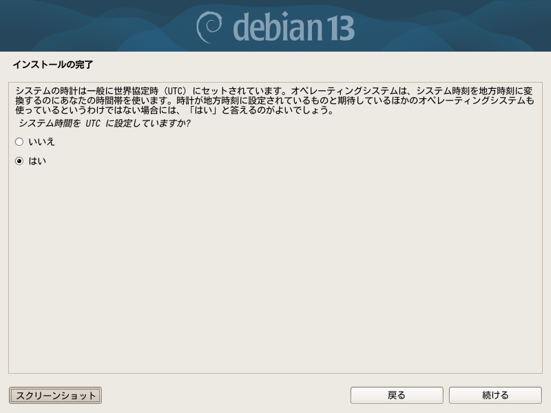 システムの時計を世界協定時(UTC)にするかを確認しています。ここでいうシステム時計はハードウェアクロックと呼ばれていたもので、マザーボード上の電池により保持されている時刻です。タイムゾーンの概念はなく、一般的な市販の時計ほどの精度で動いています。Windowsでは伝統的にこれを現地の時刻を表しているものとして扱ってきましたので、Windowsと選択起動できるようになっているPCでは地方時に設定して、Linuxの方でハードウェアクロックから得られる時刻からUTCを計算して運用するようになっていました。最近はWindowsでもUTCとする設定もできるようです。
