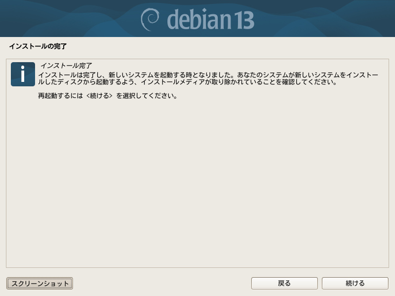 インストールメディアが取り除かれていることを確認せよと言われていますが、以前、言われるままにここでUSBメモリを抜いて[続ける]で先に進むと終了までに文句を言われたことがあります。USBメモリから読み込んだbashスクリプトを実行しているので続けられなくなるという問題のようでした。最近は改良されているかもしれませんが、正解はこのまま先に進んで、再起動がかかってからUSBを抜くという手順です。