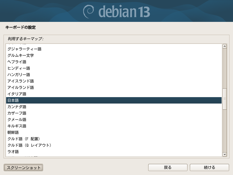今回のインストールではdebian-13.1.0-amd64-netinst.iso を https://www.debian.org/ からダウンロードして使用しました。https://www.debian.or.jp/ の方はまだ 13.0.0 のままですが、netinstなら結果は同じになるはずです。