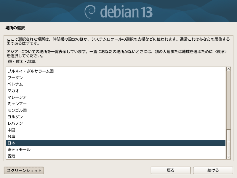 次は場所の選択です。日本語を選択したので、ここから説明も日本語です。「日本」を選び[続ける]を選びますます。説明にあるように場所の選択とはタイムゾーン(時間帯)とロケールです。