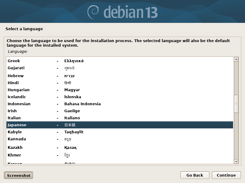 定番の流れです。まず言語選択画面です。これはインストール時に使う言語です。Englishが初期値ですが、スクロールしてJapaneseを選択し、continueします。Italianの後にでてきます。