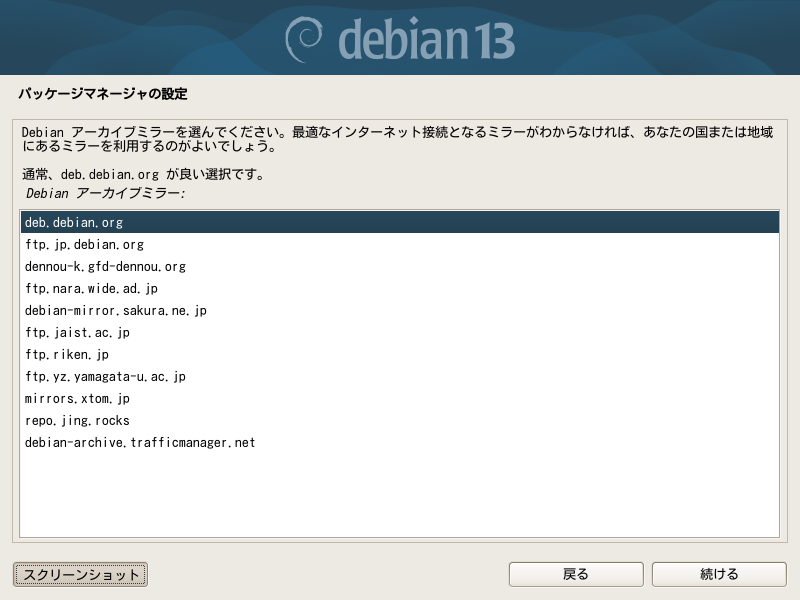 パーティションの切り分けが終わればOSのインストールですが、ネットインストールはインターネット上のアーカイブからデータを取り寄せて行います。Debianのアーカイブは各所にありますから、どこから取り寄せるのが速いかの選択です。日本でいいでしょう。