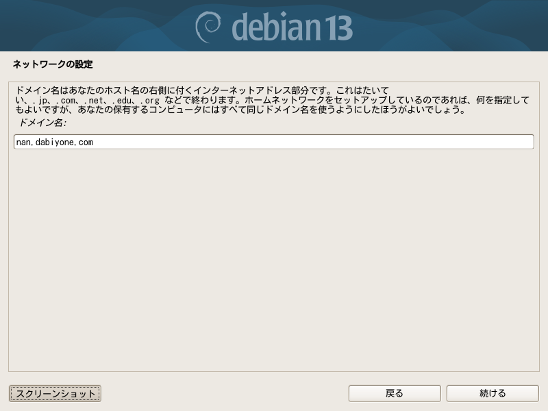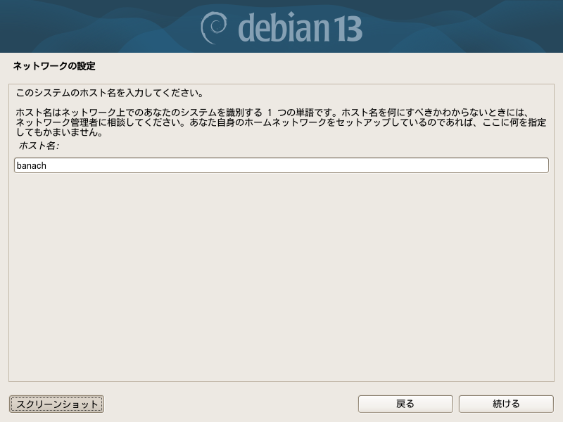 ホスト名はローカルネットワークに複数のコンピュータを置く場合に識別するための名前ですが、機構上一台でも必要です。初期値としてはdebianが入っています。今回はストレージの交換とOSのバージョンアップなので前につけていた名前と同じものにします。本当は前のホスト名と異なる名前にしたほうが面倒がないのですが、頻繁に変えると人間側で混乱します。異なるOSになったのに同じ名前のままだと、異なるコンピュータが名前を偽ってなりすましていると疑われることがあります。sshで以前接続していたコンピュータから再接続する時に警告が出ますが、知っていれば簡単に対処できます。