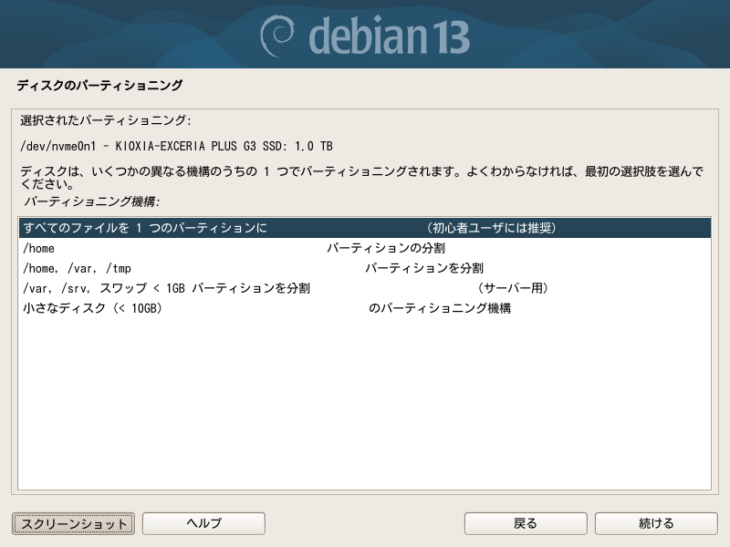 初心者ユーザーに推奨されている1つのパーティションにするのが一番上にあってこれが初期値です。