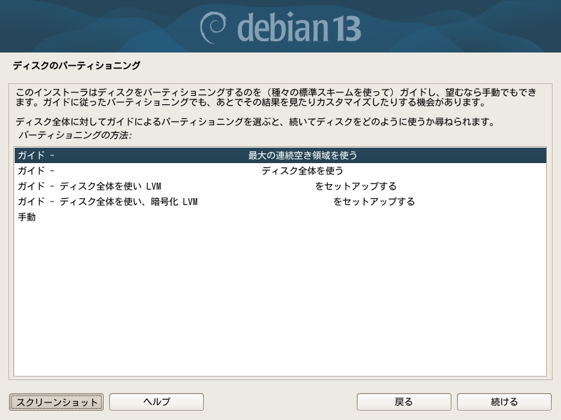 インストールするディスクを選んでから、ガイドを使って自動で分けるか手動にするかを選ぶのが順序だろうと思ってしまいますが、LVMが複数のディスクをまとめて管理するように設定できることからこの順番にせざるを得ないのでしょう。このへんは事情を知らないと迷うところだと思います。