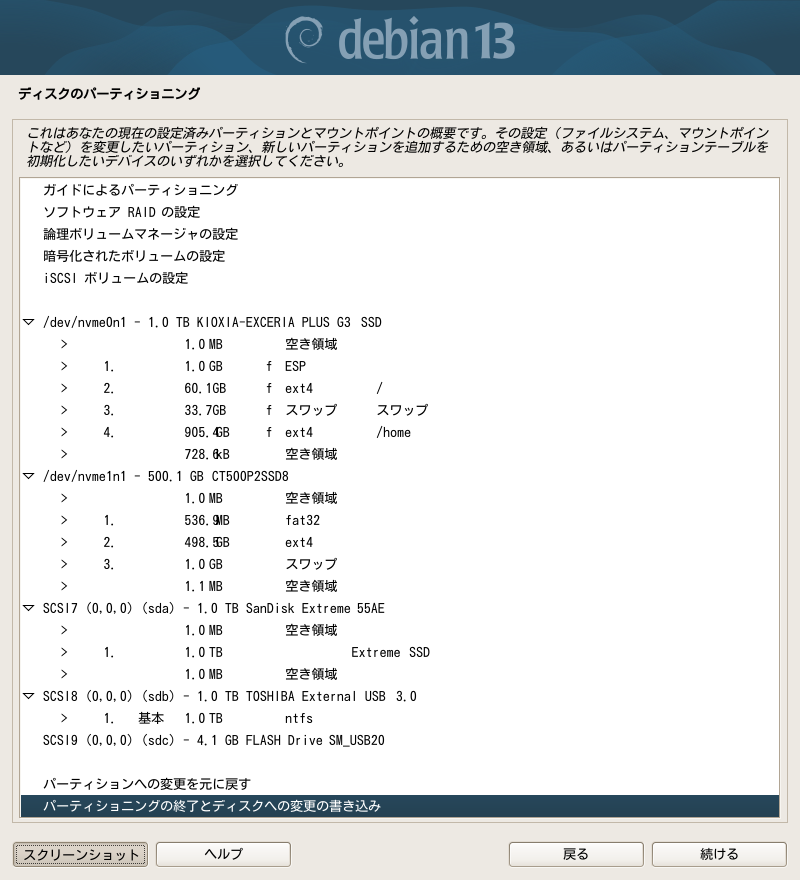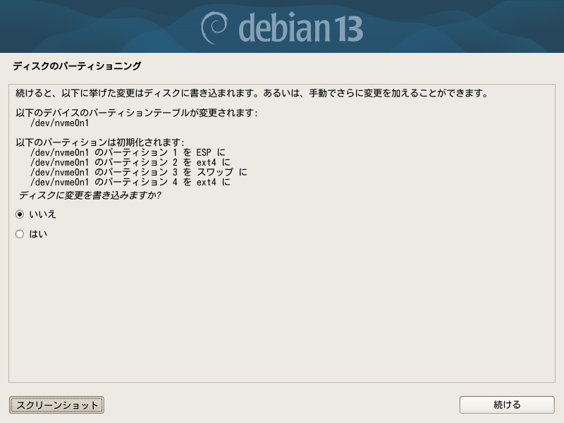 これで良いならば、下方の「パーティショニングの終了とディスクへの変更の書き込み」を選択して[続ける]をクリックします。