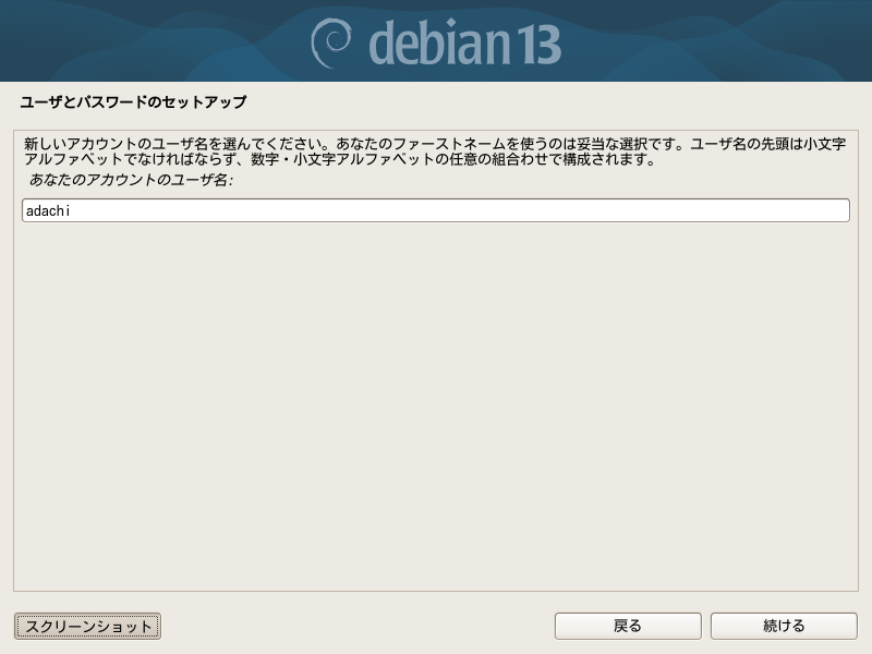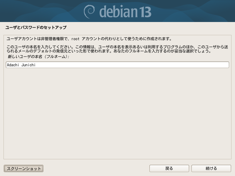 以前は、ここで入力する名前(フルネーム)は /etc/password ファイルに書かれるだけで、ログイン時に表示されるのは短いユーザー名だったのですが、最近はここのフルネームが表示されて選択するようになったので、知らないとユーザー名の概念がつかみにくいかもしれません。多分漢字でも問題ないと思いますが、やってみたことはありません。