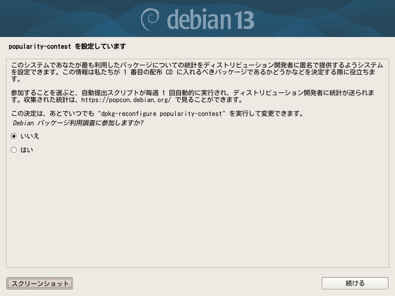 どんなパッケージを必要としたかの統計に情報を送ることを許すかどうかの設定です。最近のデフォルトは「いいえ」です。どちらでも。