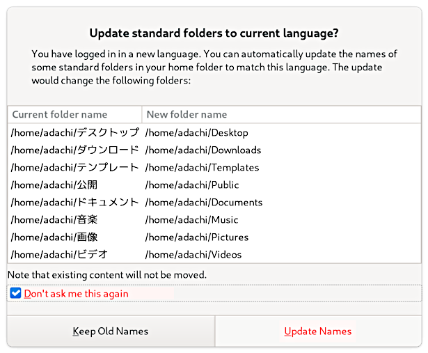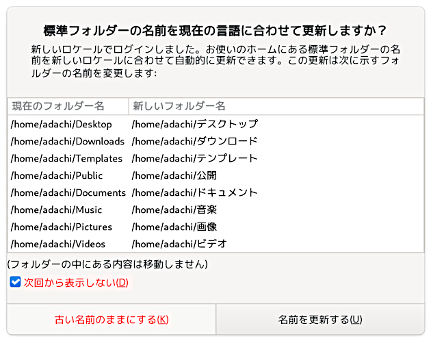 次回のログインの時に、ja_JPロケールなのに英語のフォルダー名なのを感知して(日本語で)確認してきますので、このままでいいと「次回から表示しない」にチェックをいれて [古い名前のままにする] をクリックします。