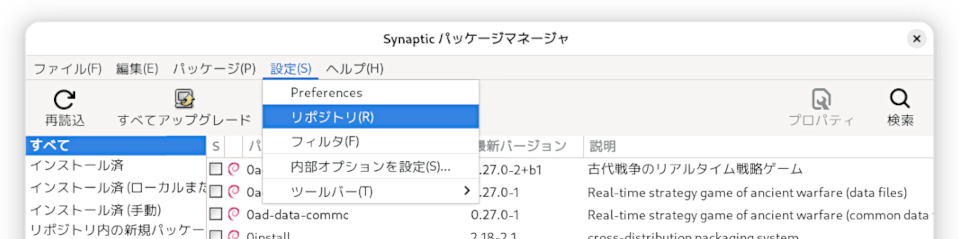 synapticの「設定」-「リポジトリ」から設定の変更をします。