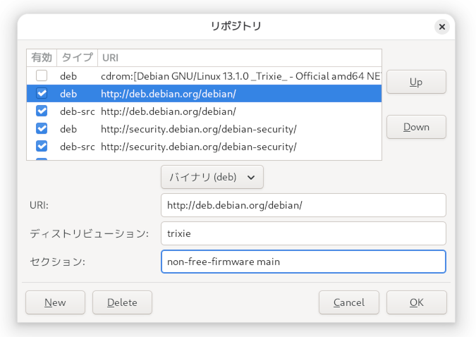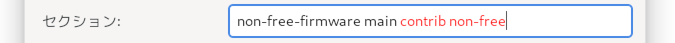 有効になっているURIを選択するとセクションの項目に non-free-firmware main と2つのセクションが書かれています。